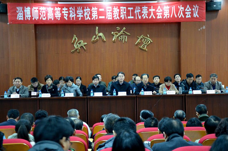 1月25日上午,淄博师专第二届教职工代表大会第八次会议在学校奂山论坛召开。主席团成员在主席台就坐。148名正式代表、11名列席代表、12名特邀代表出席大会。党委书记王维华发表讲话,校长王久亮代表学校作工作报告。副校长秦克铸主持大会。