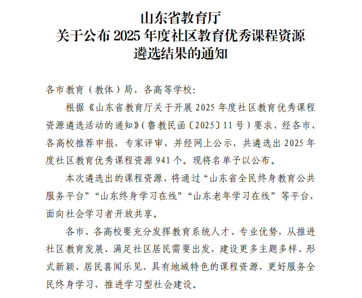 山东省社区教育优秀课程资源遴选和社区教育教材立项工作由省教育厅牵头组织,核心目标聚焦社区教育内涵发展,旨在加快全省社区教育信息化建设进程,推动信息技术与教育教学深度融合,促进优质课程资源开放共享,满足继续教育学生及社区居民多样化、个性化的学习需求,为构建全民终身学习体系提供有力支撑。