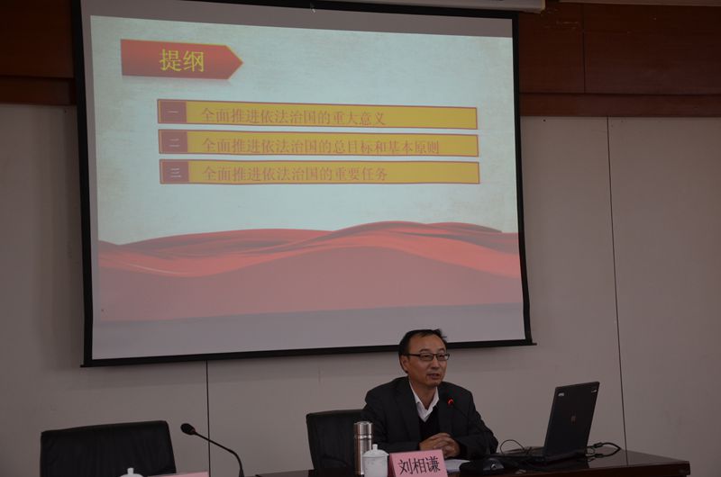 11月25日上午,市委党校教授刘相谦来到淄博师专,为党员干部做了题为“全面推进依法治国的战略部署——党的十八届四中全会精神解读”的报告。学校领导班子成员,中层正、副职及助理,主持单位工作的科级干部,院系辅导员、班主任代表等近百人参加了报告会,报告会由副校长周巧玲主持。