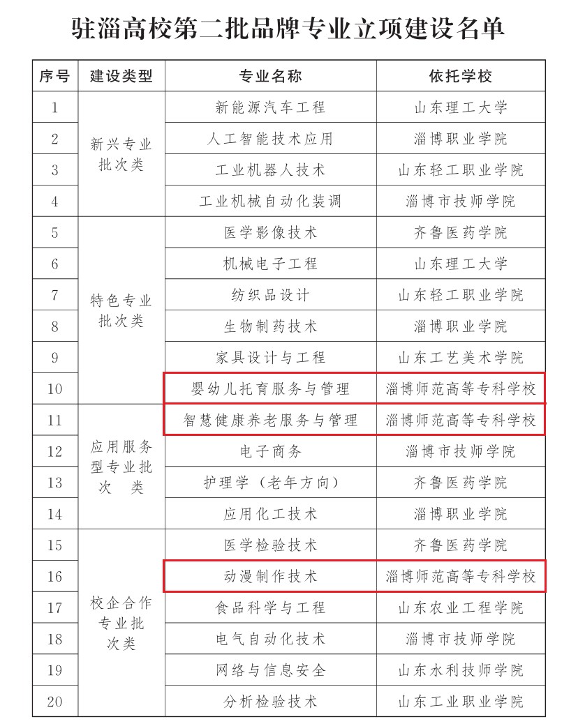 本批次品牌专业的评审,各驻淄高校高校重视,项目质量比第一批次均有较大提升。经专家评审、会议研究审定、社会公示等环节,最终确定了淄博师专等10所高校的20个专业为驻淄高校第二批“四个一批”品牌专业建设项目。