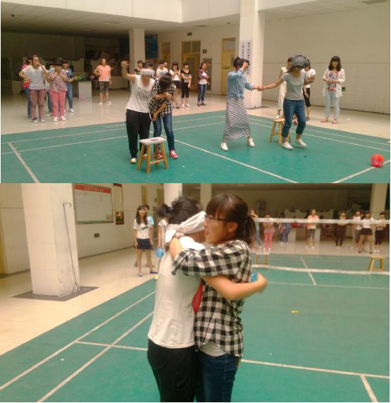 活动的主要内容是参加此活动的同学进行现场抽签,两人为一组,一人被蒙住眼睛为“瞎子”,另一个成为瞎子的“眼睛”。在起点两人背对背转十圈,然后两人一起手拉手向前走,瞎子越过板凳、踩破气球,穿过羽毛球网,再次越过板凳,然后两人面对面把气球击破,快速走到答题板,猜成语,答对后瞎子迅速背起他的眼睛,按原路返回跑向起点,用时最短的为胜者。主持人宣布完比赛规则后,瞎子和眼睛们在欢快的音乐中开始了他们的探险旅程。比赛场地洋溢着同学们的笑声和加油声。时不时有其他班级同学也现场报名参加。
