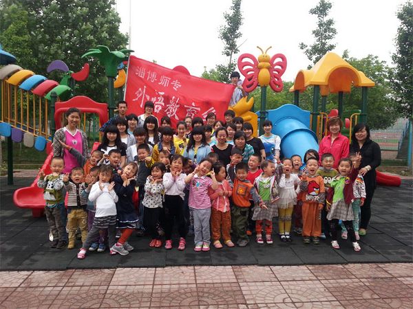 5月29日,外语教育系学前双语班的同学们来到淄博师专附属幼儿园,与孩子们共同迎接六一国际儿童节。