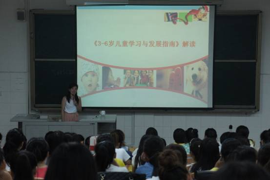教育部关于印发《3-6岁儿童学习与发展指南》的通知中,要求各地要把《指南》作为当前幼儿园教职工、学前教育教研人员和管理干部业务培训的主要内容。学前教育学院非常重视指南的学习与宣传,结合专业特点,学院安排由各班骨干学生参加的专题讲座培训。