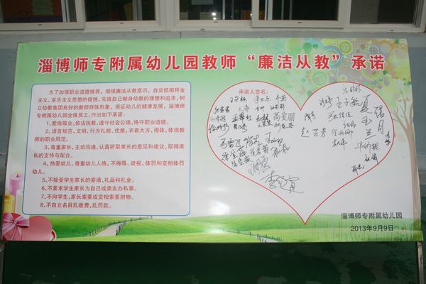 淄博师专幼教集团历来重视党风廉政建设,坚持“抓党风,促教风”,师德师风建设成效显著。“廉洁从教承诺”签名活动旨在进一步提高教师职业道德素养,增强廉洁从教意识,自觉抵御拜金主义、享乐主义思想的侵蚀,实践自己献身幼教的理想和追求,保证幼儿身心健康发展。