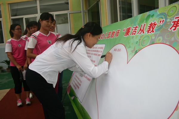 2013年9月9日,在第29个教师节来临之际,幼教集团举行了“廉洁从教”承诺签名活动。集团党支部发出的“廉洁从教”倡议得到了老师们积极响应,老师们纷纷在承诺书上庄严地写下了自己的名字,承诺:爱岗敬业,依法执教,遵守社会公德,恪守职业道德;热爱幼儿,尊重幼儿人格,不侮辱、歧视、体罚和变相体罚幼儿;不接受学生家长的宴请、礼品和礼金;不要求学生家长为自己或亲友办私事;不向学生、家长索要或变相索要财物;不自立名目乱收费,乱罚款。