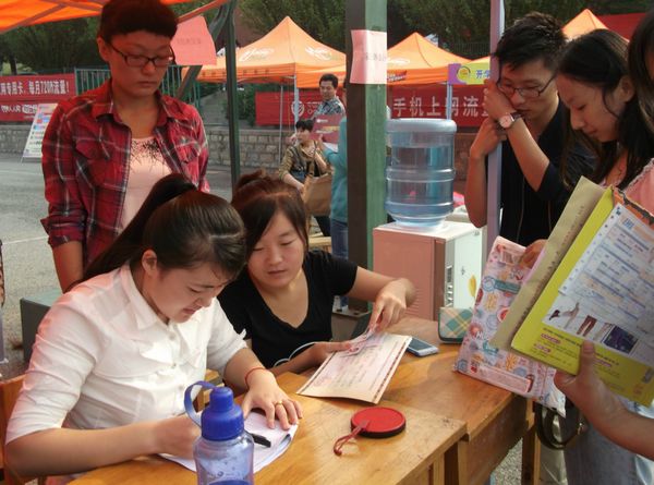 注册处工作人员认真核对新生准考证、身份证等各类信息