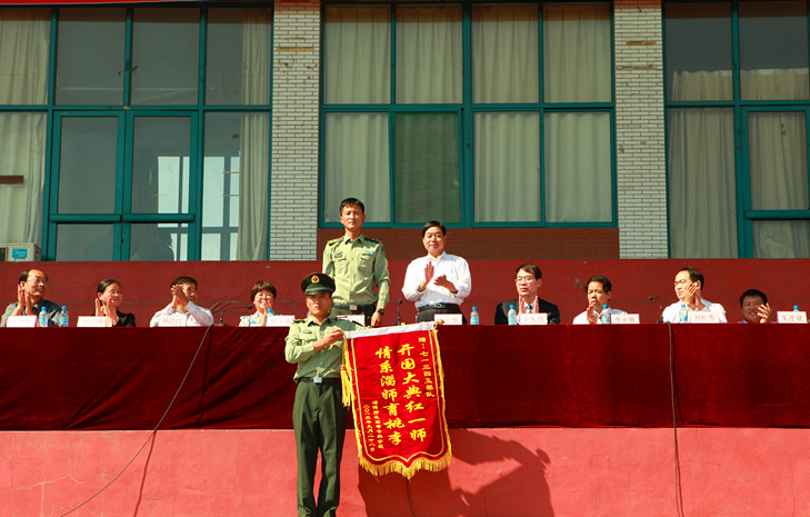 最后,王维华书记还代表学校向71345部队赠送了锦旗,学生代表向教官送上鲜花,表达了对全体承训教官的感谢和崇高的敬意!