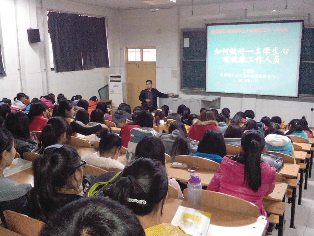 11月8日下午,由大学生心理健康教育中心举办的学生心理健康教育工作人员培训第一次讲座在第二阶梯教室顺利举行,来自全校各系共230名学生参加了此次培训。本次讲座由大学生心理健康教育中心主任王福臣主讲并拉开了第四期学生心理健康教育工作人员培训的序幕。