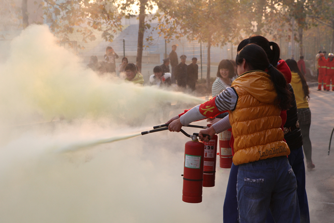 15时30分,7号公寓211宿舍一名女生发现火情,边喊着火,边跑着向宿管老师报告。宿舍管理员随即鸣哨,向学生发出紧急疏散通知,切断楼寓电源,迅速打开应急通道。 “呜…呜…”一声声急促的警报声骤起,学生(引导疏散员)迅速到位引导学生逃离;学生 (灭火队)立即向着火点集合,开消防箱,铺消防水袋,紧张有序;同学们自觉的用毛巾捂住口鼻,弯着身躯,沿着楼道两侧迅速撤离各个楼层;学校护卫队接警后,启动应急机制,携带灭火设备立即赶赴火灾现场灭火疏散。在不足7分钟时间内,九百余名学生全部疏散至操场等安全地带。在整个演练过程中,学生灭火队、疏散队、宿管工作人员、校卫队等在各环节配合紧密,协调有序。演练结束后,校卫队老师现场向同学们讲解演示了灭火器的使用方法,并让学生分组练习操作,掌握灭火器等消防器材的使用方法。