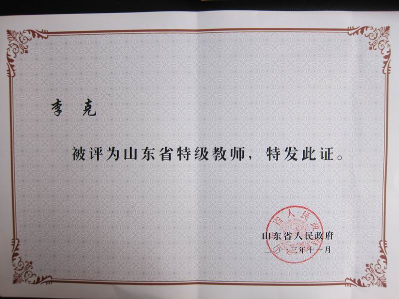 “山东省特级教师”评选每三年表彰一次,李克老师本次获选,是经过逐级推荐、说课、教学答辩、材料评审、考察、公示等多个环节的严格筛选后,从全市推荐教师中脱颖而出。
