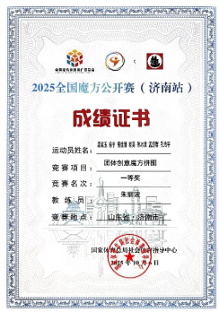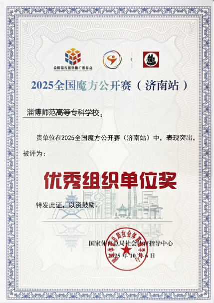 近日,由国家体育总局社会体育指导中心主办的“GANCUBE魔方杯”2025年全国魔方公开赛在济南拉开帷幕。来自全国26个省市的86支队伍同台竞技。我校魔方社团由信息系14名同学组成参赛团队,以“淄博蹴鞠文化”为主题进行创意设计,全力冲击团队魔方拼图项目。参赛团队凭借鲜明的文化创意、稳定的现场发挥与生动的文化表达,取得M18组别一等奖。学校获大赛组委会授予“优秀组织奖”。