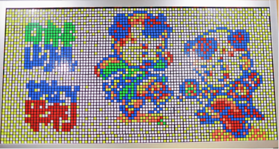 比赛现场氛围紧张热烈,14名队员分工明确、默契联动,有的负责分区域把控色彩基调,有的专注精准校准图案比例,手持512个魔方指尖灵动翻飞,在快速翻转与精准拼接中稳步推进创作。当最后一个魔方精准归位时,一幅极具传统文化特色的“蹴鞠全景图”赫然呈现,吸引了评委与观众纷纷驻足细观。在后续的创意汇报答辩中,队员们结合淄博蹴鞠的历史渊源与魔方竞技的逻辑思维,深入阐述了“传统文脉与益智运动融合”的设计理念;在现场拉票环节,他们通过互动演示清晰呈现魔方拼图与蹴鞠文化的内在关联,进一步传递地方传统文化魅力。