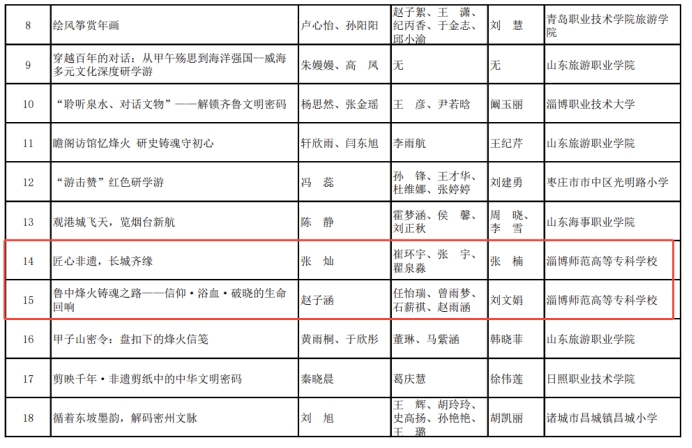 近日,淄博师专文旅学院师生在由山东省文化和旅游厅、山东省总工会、山东省教育厅、山东省农业农村厅、山东省绿色低碳高质量发展先行区建设领导小组办公室、山东省精品旅游促进会共同主办的“2025第六届山东省研学旅游创新设计大赛”和由山东省科学技术协会、山东省教育厅、共青团山东省委、山东省发展和改革委员会、山东省工业和信息化厅、山东省人力资源和社会保障厅联合主办的“第十七届山东省大学生科技节---第五届山东省大学生互联网+康养旅游大赛”两项省级文旅赛事中表现亮眼,凭借扎实的专业功底和创新的实践方案,斩获多个奖项,展现了学院在文旅人才培养方面的突出成效。