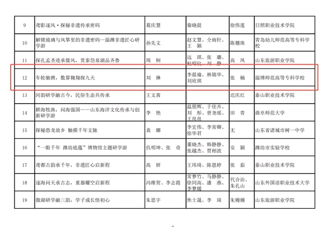 在第五届山东省大学生互联网+康养旅游大赛中,淄博师专文旅学院师生多点开花,收获颇丰。在康养旅游线路设计赛道,凭借兼具实用性与创新性的康养旅游线路方案,荣获该赛道三等奖;在研学旅游赛道,学院师生围绕研学课程开发、研学基地运营等方向设计的作品获二等奖两项,三等奖六项,获奖数量和质量均位居同类院校前列。