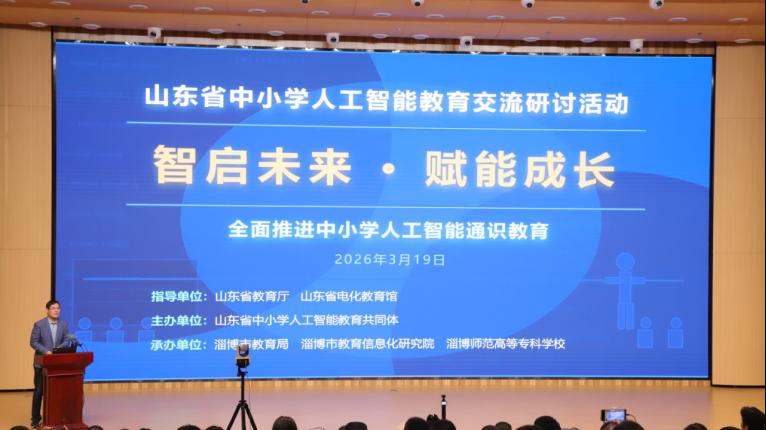 为深入贯彻落实山东省“人工智能+教育”相关实施方案与工作意见,协同探索山东特色人工智能教育发展新路径,推动中小学人工智能通识教育高质量普及,3月19日至20日,2026年山东省中小学人工智能教育共同体第二次交流研讨活动在淄博师专顺利进行。省市教育部门相关领导、各市电化教育馆负责同志,以及全省中小学人工智能教育骨干教师代表齐聚校园,共话人工智能教育发展新篇。