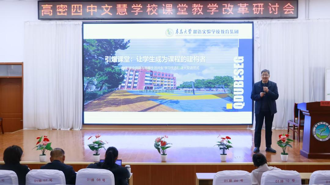 活动期间,高密四中文汇中学校长王志亮介绍了“办乡土教育,向幸福出发”的办学理念及课堂改革、教师队伍建设方面的探索。青岛大学双语实验学校教育集团研究院院长助理、齐鲁名校长姜言邦作了题为《素养课堂:让学生成为课程的建构者》的专题报告,系统阐述了SET素养课堂的时代背景、实践样态与模式凝练。